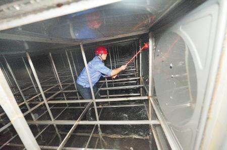 清洗水箱必須二人以上方可操作,頂上要有一名監護人員,負責向水箱內送新風,防止清洗人員余氯中毒