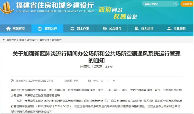 為進(jìn)一步貫徹落實(shí)國(guó)務(wù)院應(yīng)對(duì)新型冠狀病毒肺炎疫情聯(lián)防聯(lián)控機(jī)制綜合組《關(guān)于印發(fā)新冠肺炎流行期間辦公場(chǎng)所和公共場(chǎng)所空調(diào)通風(fēng)系統(tǒng)運(yùn)行管理指南的通知》,防止因空調(diào)通風(fēng)系統(tǒng)開(kāi)啟而導(dǎo)致新冠肺炎疫情的傳播和蔓延,日前,省住建廳印發(fā)《關(guān)于加強(qiáng)新冠肺炎流行期間辦公場(chǎng)所和公共場(chǎng)所空調(diào)通風(fēng)系統(tǒng)運(yùn)行管理的通知》。
